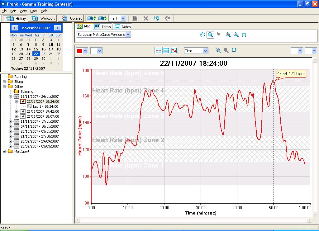 Spinning class at Europa Pools. Logged on the Garmin Forerunner 50 once I got the right strap paired with it. New music for tonights class and there is no second guessing Sheila. First off everyones position on the bike was checked so you don’t end up riding in the wrong position. Structure was a bit different and there was a fair bit of sprinting out of the saddle. At the end there was five minutes on the mat doing abbs. Like I have said previously once you have been shown how to do them once they are very effective. This is the first time for the guy opposite who is a fairly regular spinner and he feels it just like I did the first time. Shower, home.