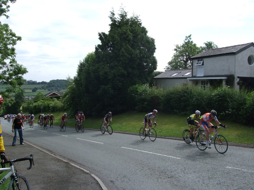t Aldford Bridge we stop to watch the roadrace come through with the break at 20 seconds. The finish line is further down the hill, a small group of riders formed waiting for the race to go by and then it ws off to the first control at the Ice Cream Farm at Great Budworth. Pity they can’t make it car free but it’s been a nice ride up to now.