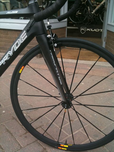 Back at the shop the matt-black Alize is being assembled with matt being the new black. It is paired with a development pair of matt-black Mavics with what I think is a ceramic braking surface.